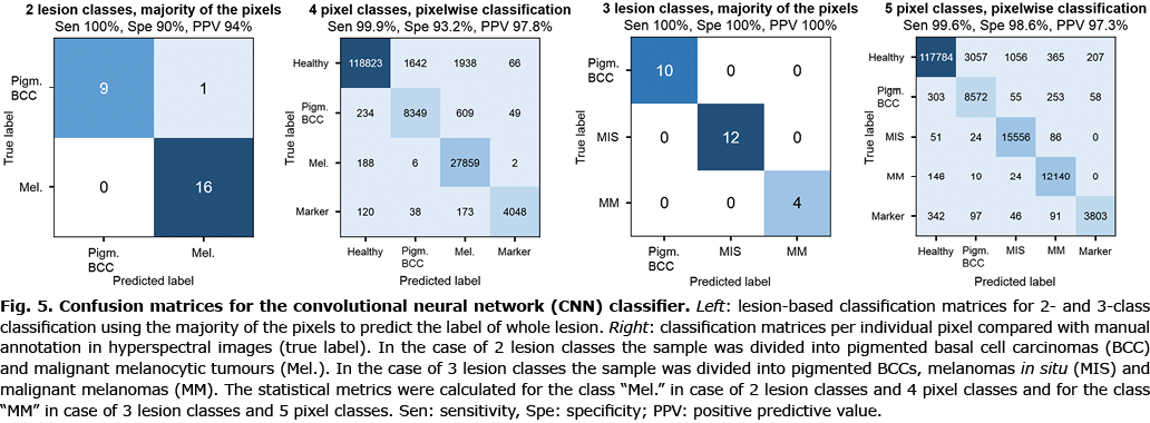 This study also tested the accuracy of the CNN classifier, by dividing the sample into 3 groups: pigmented BCC (n = 10), MIS (n = 12) and MM (n = 4), and then used the classification maps to acquire an automated diagnosis for every lesion in a manner similar to that described above. Classifier accuracy by individual pixels was also computed (5 pixel classes). In the lesion classification using the majority of pixels, calculated sensitivity was 100% (4/4) (95% CI 51–100), specificity 100% (22/22) (95% CI 85–100) and PPV 100% (4/4) (95% CI 51–100) in distinguishing MM from other lesions (MIS and pigmented BCC). In pixel-wise classification between tumour classes only, the statistical characteristics for class “MM” were as follows: sensitivity 99.6% (95% CI 99.5–99.7), specificity 98.6% (95% CI 98.5–98.8) and PPV 97.3% (95% CI 97.0–97.6). The confusion matrices for 3-class lesion classification and 5-class pixel-wise classification are shown in Fig. 4. The result of the CNN classification for all lesions in comparison with true histopathological diagnoses is shown in Table I. The difference in the spectra between different lesion types and healthy skin is shown in Fig. S3.