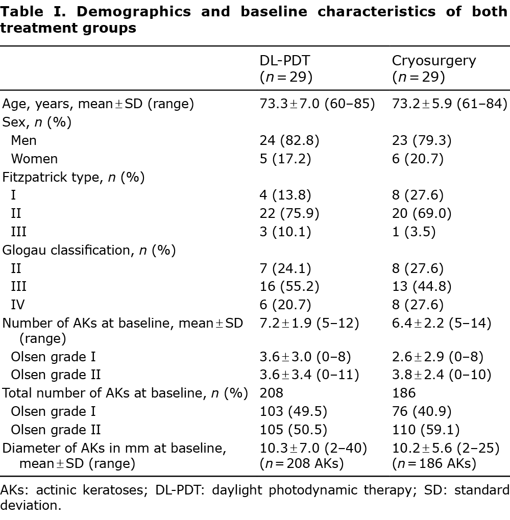 Of the 58 patients enrolled in this study, 29 were randomized to receive DL-PDT and 29 to receive cryosurgery (see Fig. 1 for the Consort flow diagram). Patients’ demographics and baseline characteristics are shown in Table I; all patients demographics (age, sex) and baseline characteristics (Fitzpatrick type, Glogau classification, number of AKs at baseline, diameter of AKs) were equally distributed across the two treatment groups.
