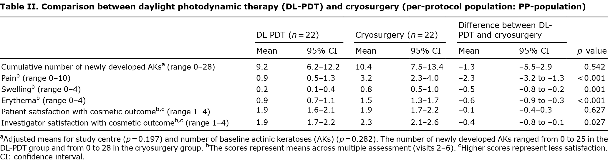 Primary outcome (the cumulative number of newly developed AKs and documented AKs between visits 2 and 6) was compared between the 2 treatment groups using an analysis of covariance (ANCOVA) with treatment (DL-PDT vs cryosurgery) as a fixed factor and the initial number of AKs at baseline as well as the study centre as covariates. Adjusted means and associated 95% confidence intervals (95% CI) were reported. The primary outcome analysis was carried out on the ITT and PP populations and was 2-sided at the significance level of 0.05.