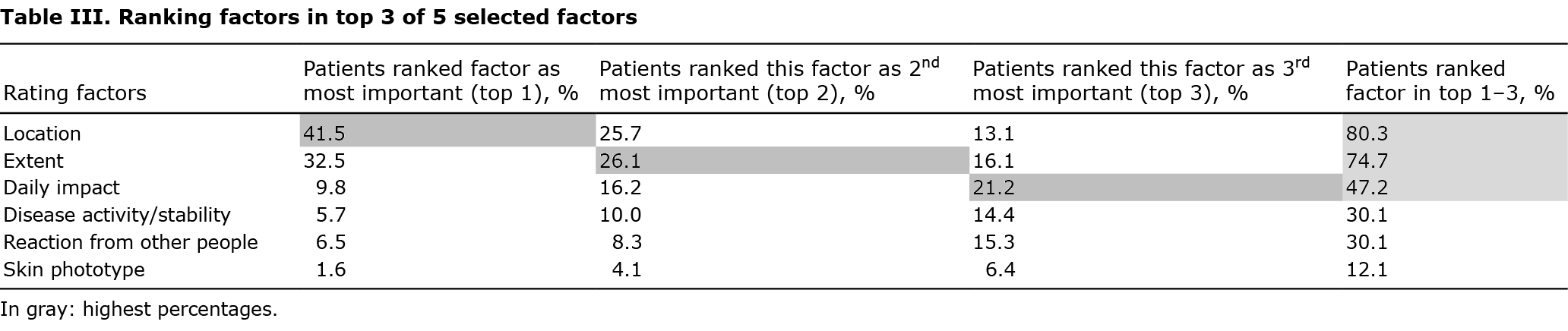 When patients were asked to rank the same 10 items in a top 5 according to relevance in the contribution to severity perception, the highest ranks were observed for the location of lesions (ranked in top 1: 41.5%, ranked in top 1–3: 80.3%), followed by disease extent (ranked in top 1: 32.5%, ranked in top 1–3:74.7%) disease impact (ranked in top 1: 9.8%, ranked in top 1–3: 47.2%) and disease activity (ranked in top 1: 5.7%, ranked in top 1–3: 30.1%) (Table III).