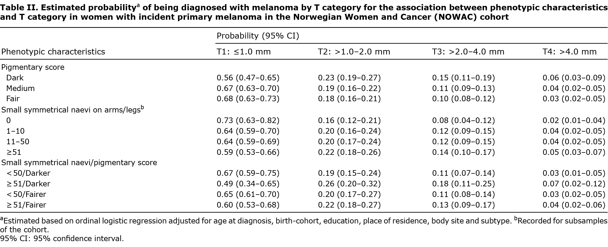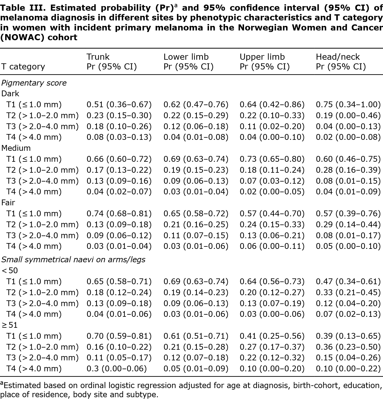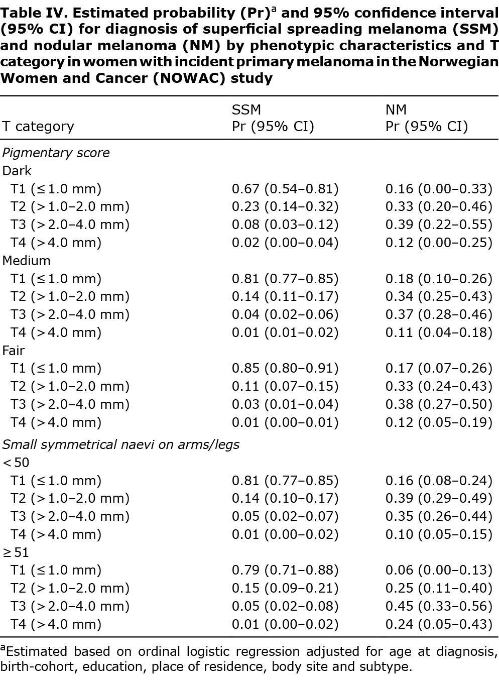 A pigmentary score was constructed by summing the values of skin colour (dark = 0, medium = 1, light = 2), eye colour (brown = 0, blue = 1, grey/green/mixed = 2), hair colour (dark brown/black = 0, brown = 1, blond/yellow = 2, red = 3), and freckling when sunbathing (no = 0, yes = 1) and categorized as dark (score < 3), medium (scores 3–5) and fair (scores 6–8) pigmentary score. The association between T category and phenotypic characteristics was examined by ordinal logistic regression and estimated odds ratios for higher (thicker) vs lower (thinner) T categories with 95% confidence intervals (CIs) (14). Then, from the specified ordinal logistic regression models, the probability of being diagnosed with each specific tumour thickness category was calculated for 1 unit change in the characteristics with significant association with tumour thickness, while holding all other covariates constant. To assess effect modification, the pigmentary score was dichotomized as darker (score < 5) and fairer (score ≥ 5), and the number of small symmetrical naevi as ≤ 50 and ≥ 51, and constructed a 4-category variable. The proportional odds assumption was checked using Brant test. Models were adjusted for age at diagnosis (continuous), birth-cohort (1927 to 1943, 1944 to 1948, 1949 to 1953, 1954 to 1965), place of residence (northern, central, southwestern and southeastern Norway), education (≤ 10, 11–13, ≥ 14 years), site of melanoma and subtype. In addition, analyses were conducted by body site and the 2 most common subtypes of melanoma (SSM and NM), associated with different biological behaviour (15, 16). Multiple imputations with chained equation were used, imputing 20 data sets to evaluate whether missing information influenced the estimates. Stata, version 15 (Stata Corp. College Station, TX, USA), was used for all analyses.
