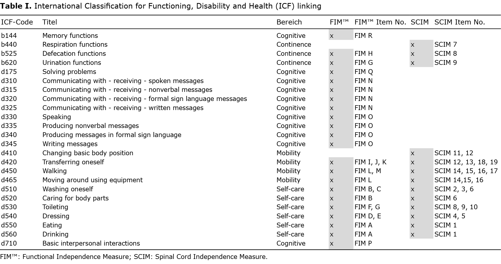 The ICF linking of SCIM and FIM™ (Table I) showed that the items of both assessment tools contain ICF categories of the chapters d4 – Mobility and d5 – Self-care, b5 – Functions of the digestive, metabolic and endocrine systems, and b6 – Functions of the urogenital and reproductive systems. Except for the categories b440 Respiration and d410 Changing basic body position, the same ICF categories are addressed through the motor items of FIM™ and SCIM. ICF categories from chapters b1 – Mental functions, d1 – Learning and application of knowledge, d3 – Communication and d7 – Interpersonal interactions and relationships occur only for the FIM™ and correspond to the cognitive items of the FIM™ (items N–R). The SCIM does not capture cognitive limitations. However, with the exception of 3 SCIM items (items1, 7 and 8), which are linked to b525 Defecation functions, b440 Respiration functions, and d560 Drinking, all other items can be mapped to the ICF Generic-30, in comparison with the FIM™, where 5 (H, N, O, Q and R) of 18 items cannot be linked to the Generic-30, including mostly its cognitive items.