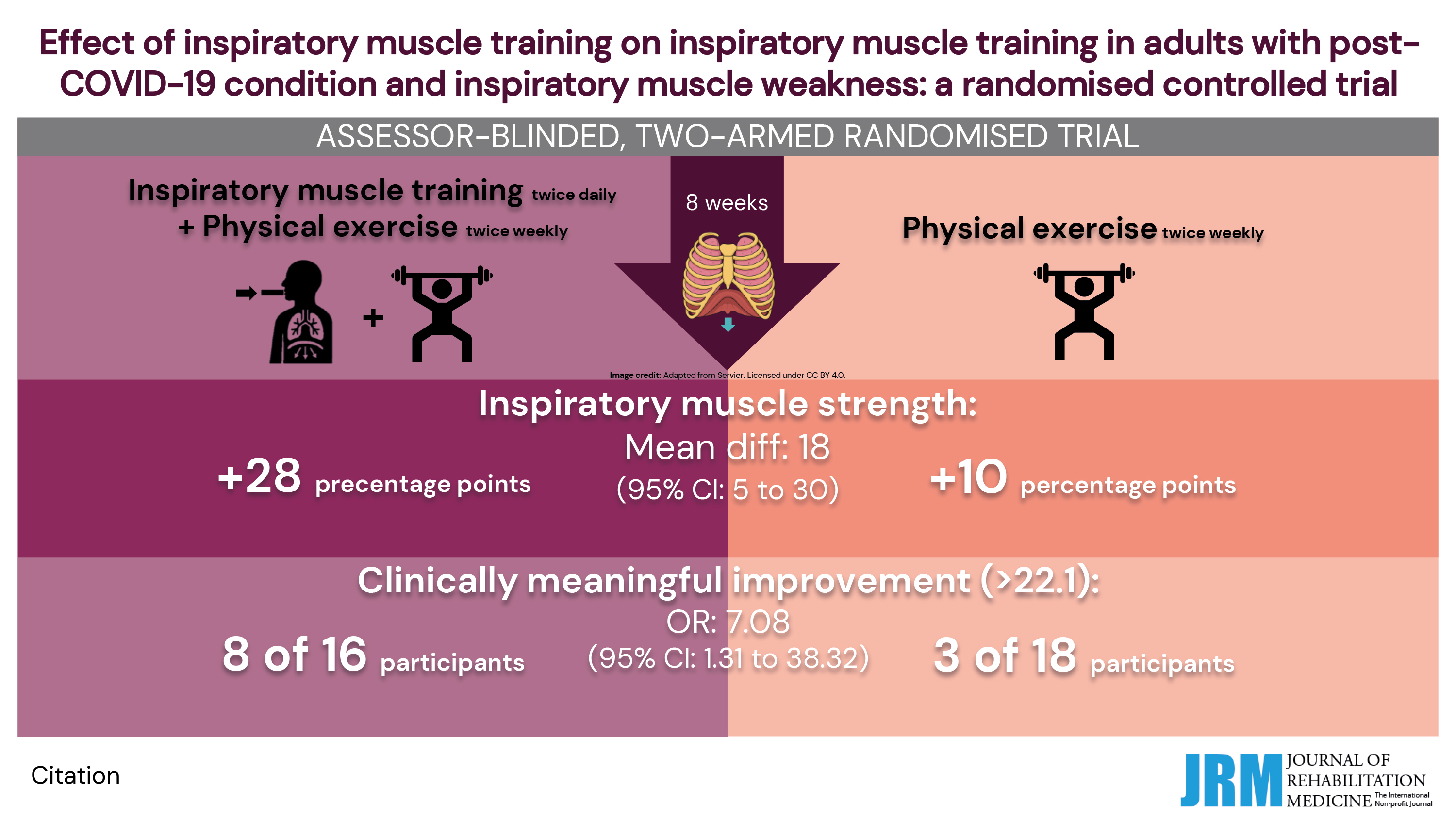 Methods: Participants were randomized to inspiratory muscle training twice daily plus individualized exercise twice weekly or exercise alone, with weekly follow-ups over 8 weeks. Primary outcome: inspiratory muscle strength (Maximal Inspiratory Pressure). Secondary outcomes: expiratory muscle strength (Maximal Expiratory Pressure); functional capacity (Six‑Minute Walk Test; One‑Minute Sit‑to‑Stand); lung function (spirometry); dyspnoea (mMRC); respiratory symptoms (chest tightness, impaired deep breathing, breathing‑related pain); cough frequency (CAAT cough item); fatigue (Fatigue Severity Scale); physical activity (Frändin–Grimby Activity Scale); activity limitations (Patient‑Specific Functional Scale); and health-related quality of life (EQ‑5D‑5L). Intention-to-treat analyses used imputed missing data. Estimated sample size: 90.